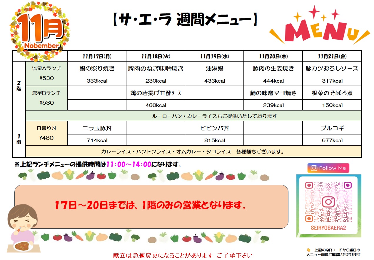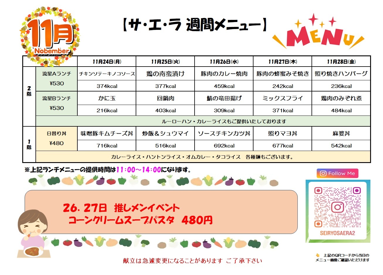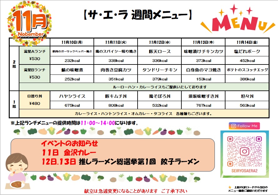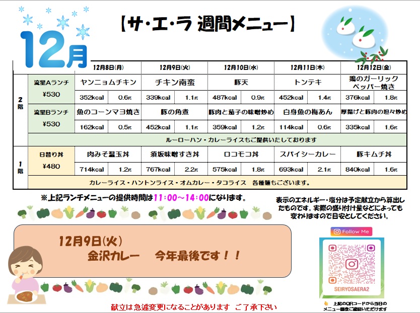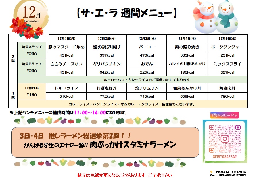 星稜食堂のメニュー紹介、きまぐれ告知板など